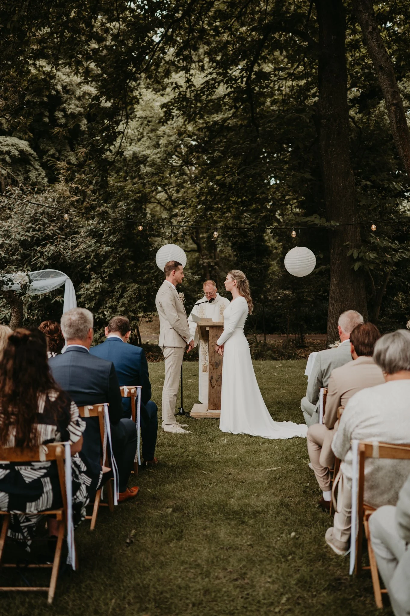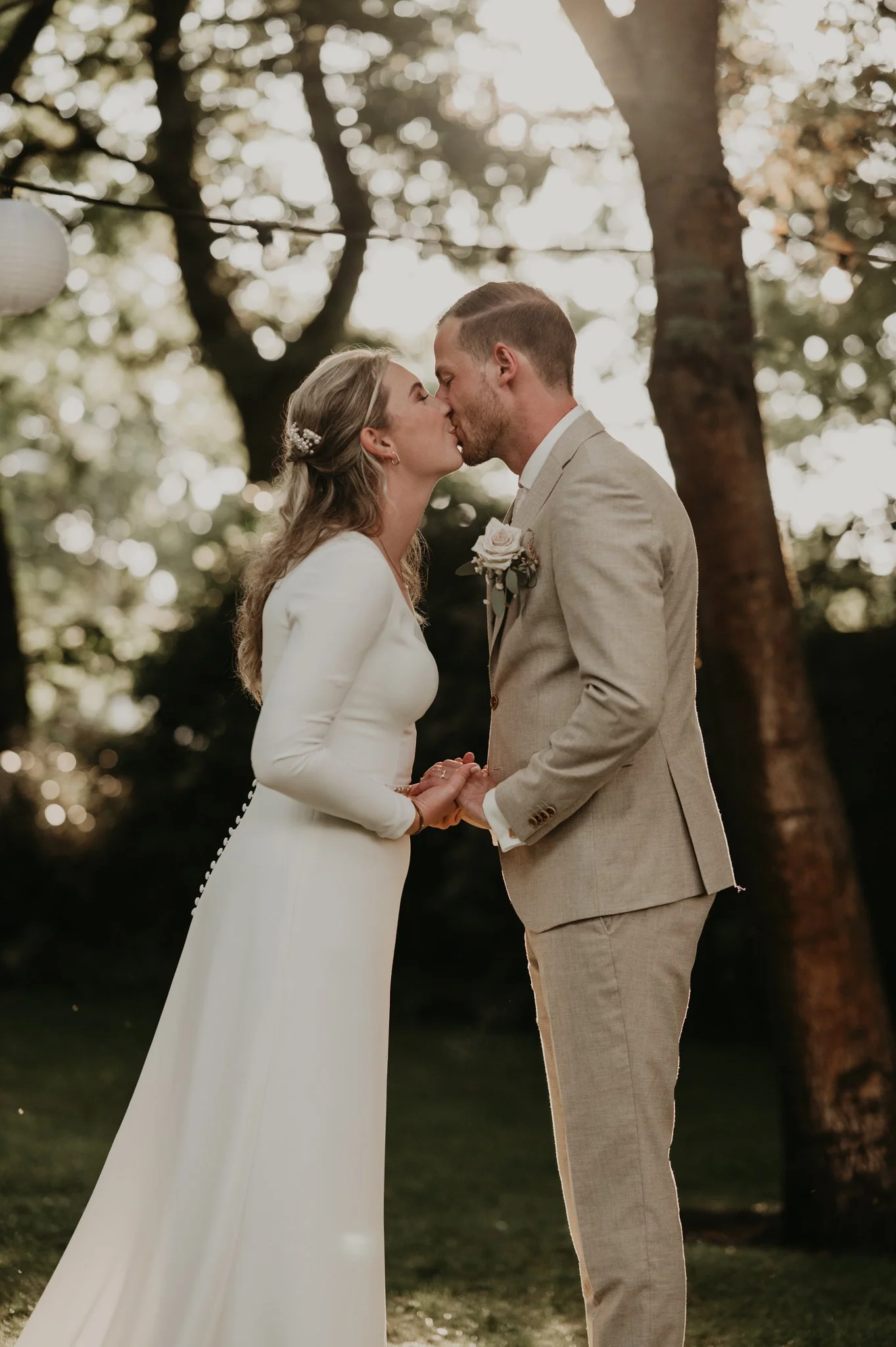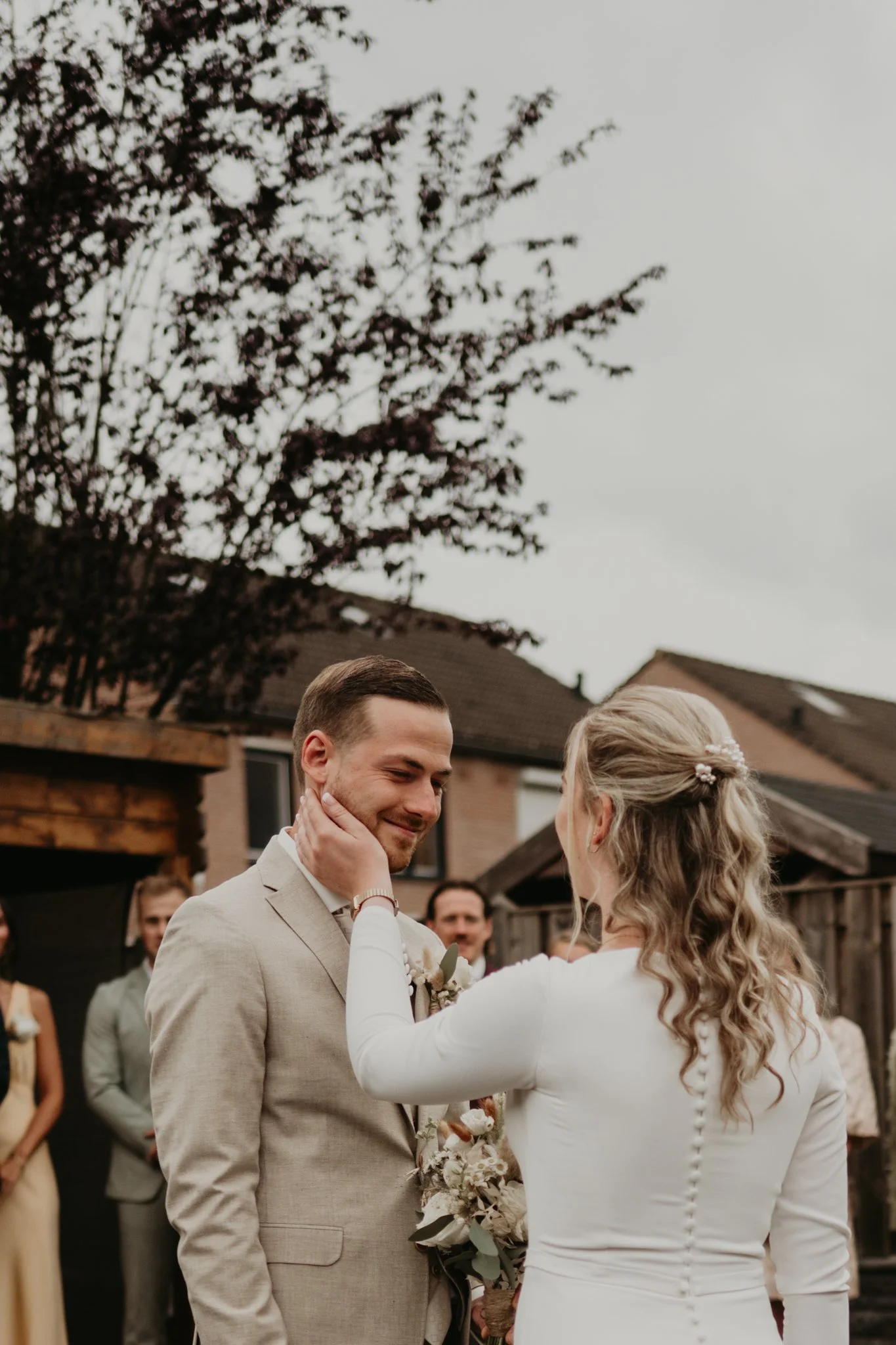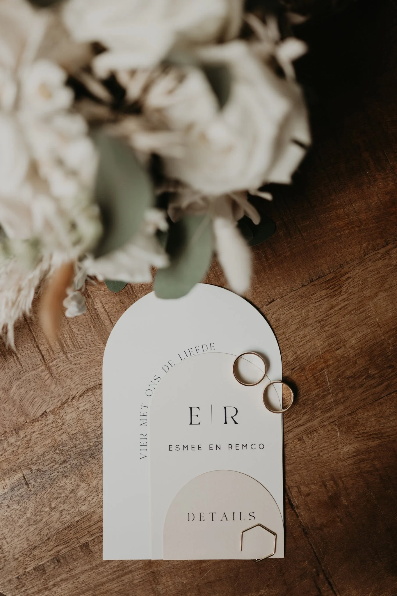 Een dag die begon met het klaarmaken en een intieme first look in eigen tuin, en eindigde met een knallend feest bij Galerie de Hoeve. Daartussen beleefden E&R een bruiloft vol liefde en bijzondere momenten. Ze gaven elkaar niet alleen het ja-woord voor de wet, maar kozen ook voor een kerkelijke ceremonie. En dat niet in een traditionele kerk, maar midden in de prachtige boomgaard van Galerie de Hoeve. Een unieke locatie die zorgde voor een romantische, ontspannen sfeer en een prachtig decor voor hun grote dag.