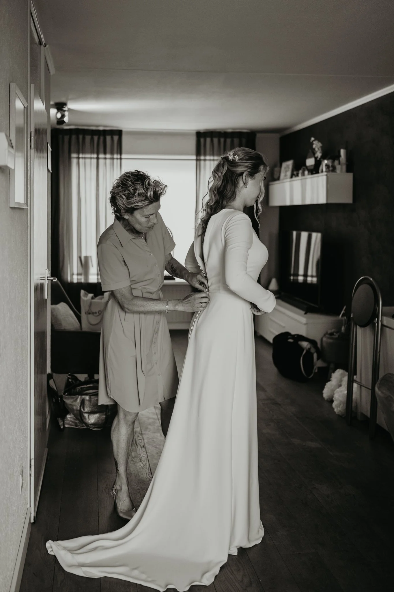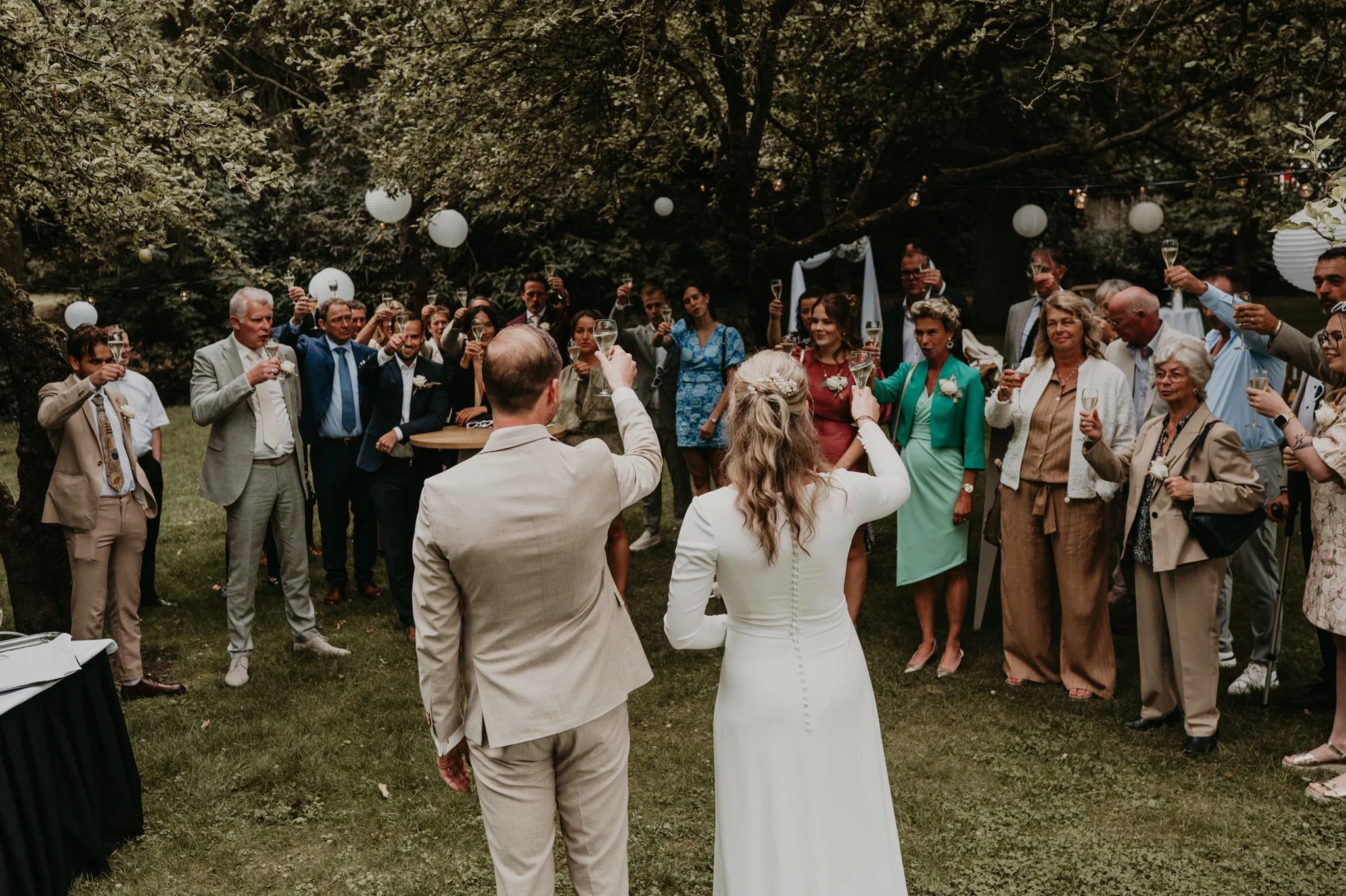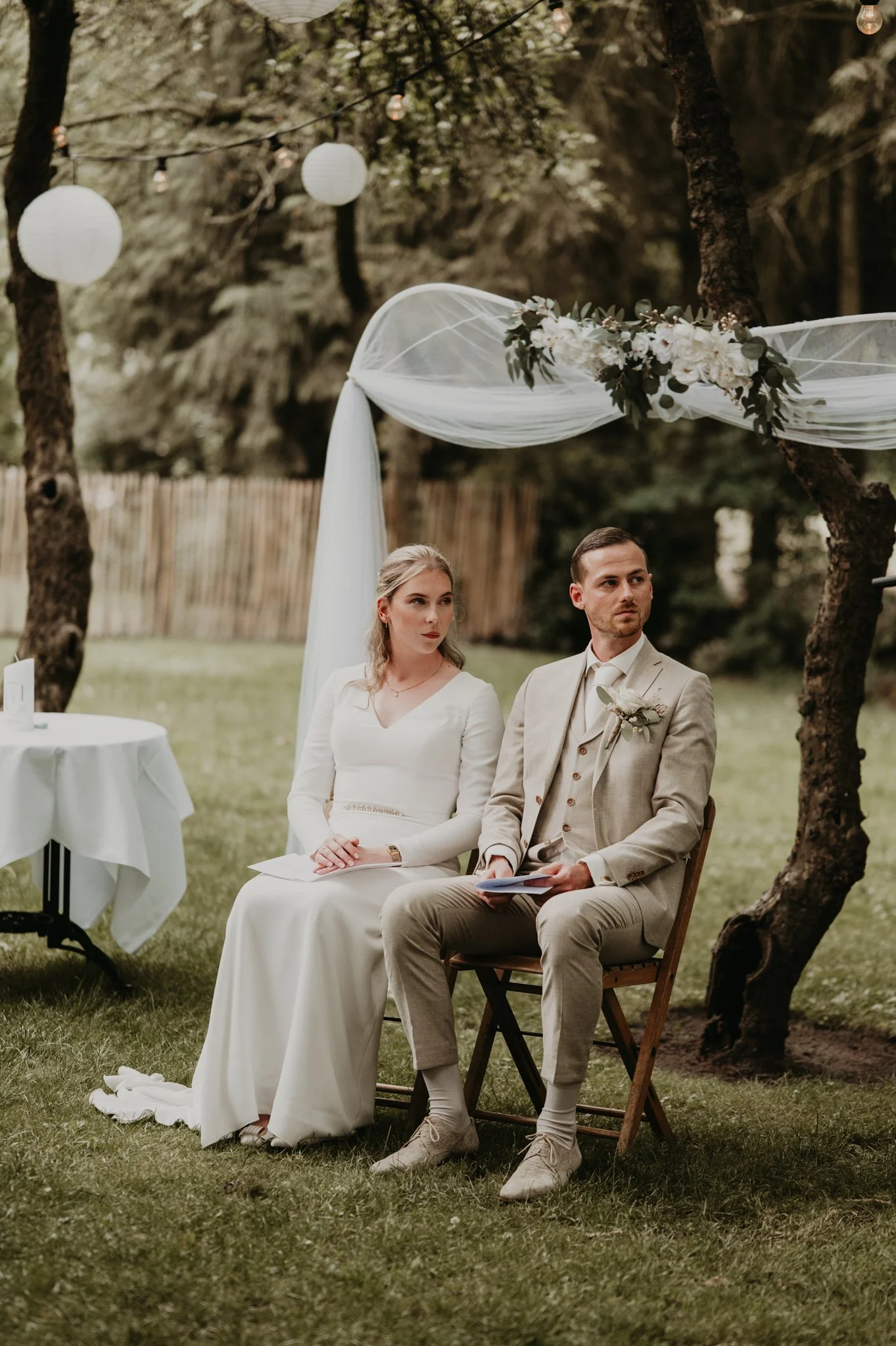 Een dag die begon met het klaarmaken en een intieme first look in eigen tuin, en eindigde met een knallend feest bij Galerie de Hoeve. Daartussen beleefden E&R een bruiloft vol liefde en bijzondere momenten. Ze gaven elkaar niet alleen het ja-woord voor de wet, maar kozen ook voor een kerkelijke ceremonie. En dat niet in een traditionele kerk, maar midden in de prachtige boomgaard van Galerie de Hoeve. Een unieke locatie die zorgde voor een romantische, ontspannen sfeer en een prachtig decor voor hun grote dag.