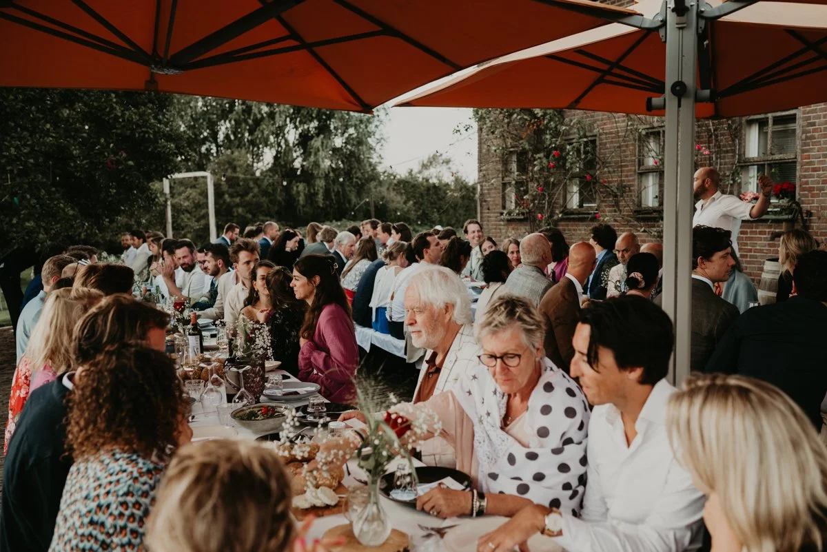 De ceremonie vond plaats tussen de fruitbomen, een prachtige plek dat bijdroeg aan de romantische sfeer. De regen liet het bruidspaar niet gek maken. Ze waren goed voorbereid door iedere gast een paraplu te geven. Bij een drupje regen pakte iedereen deze tevoorschijn om vervolgens weer weg te leggen als het droog werd. Helaas begon het uiteindelijk heel hard te regenen, waardoor iedereen snel naar de herberg is gegaan. Hier hebben we de ceremonie voorgezet.