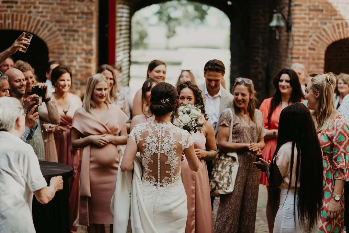 De rest van de dag werd gevierd op een geweldige trouwlocatie: Kasteel Dussen. Op de binnenplaats werd er geproost met familie en vrienden en natuurlijk werd ook de bruidstaart aangesneden. Tussendoor namen we de tijd om rondom het kasteel prachtige trouwfotoβs te maken.