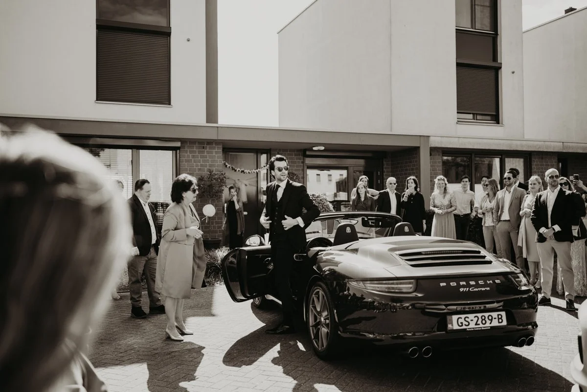 Na het klaarmaken was het tijd voor een bijzonder moment. De bruidegom vertrok in de prachtige auto van zijn vader naar zijn bruid. Alle daggasten stonden al klaar om de first look te zien. Een moment vol spanning en emotie, waarbij het bruidspaar elkaar voor het eerst zag op hun trouwdag.