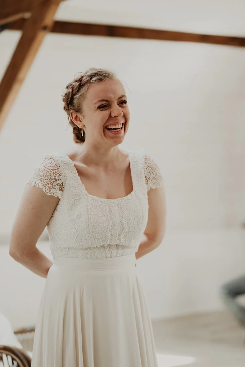 De bruid maakt zichzelf klaar op de locatie. Haar haar en make-up doet ze zelf