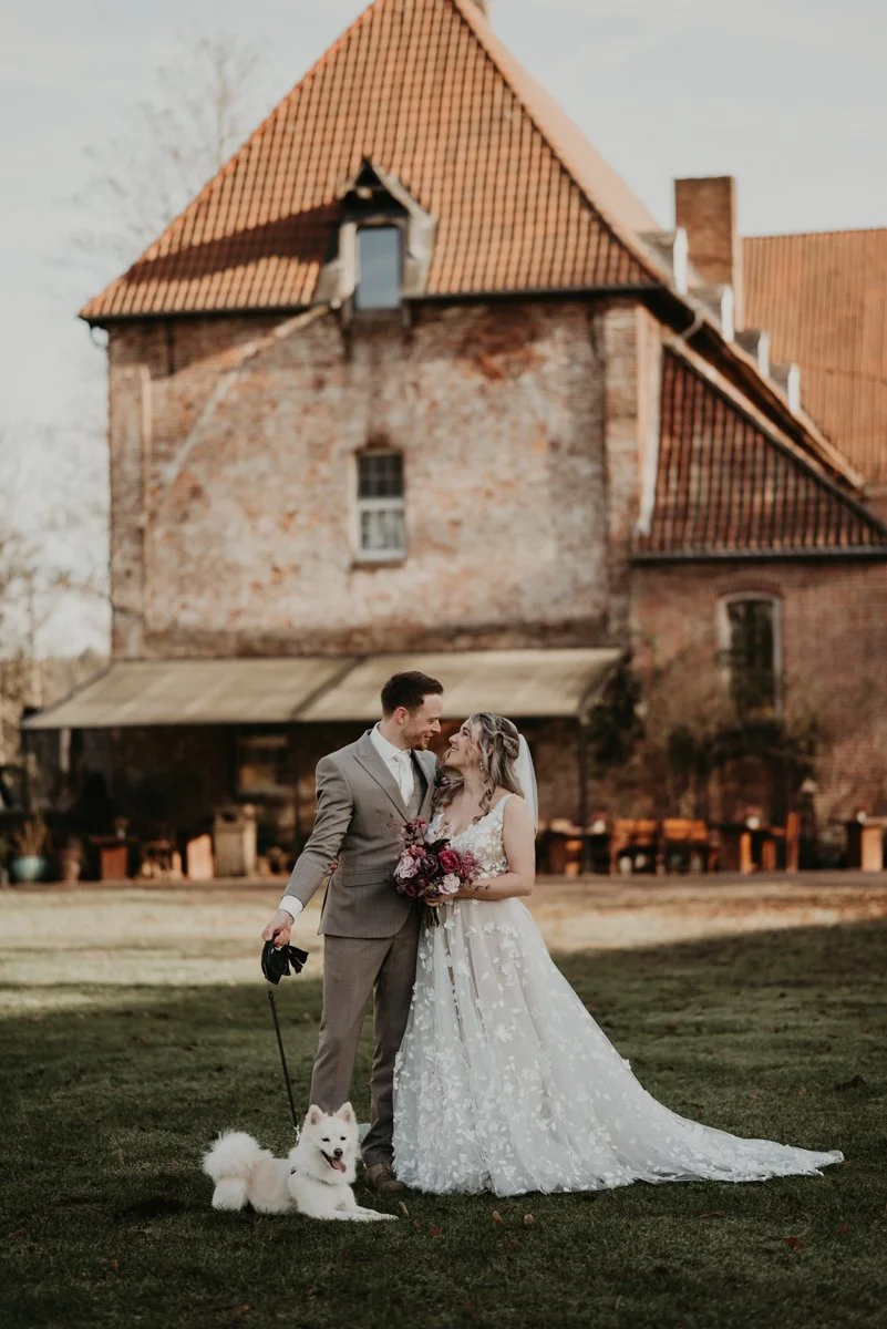 De zon was lekker gaan schijnen, waardoor we buiten rond het klooster fotoβs konden maken. Rond Kloster Graefenthal zijn genoeg mooie plekjes voor de fotoshoot. Zo kunnen we binnen fotoβs maken, op het grasveld rond het klooster en bij het water. Ook hun hondje mocht mee op de foto.