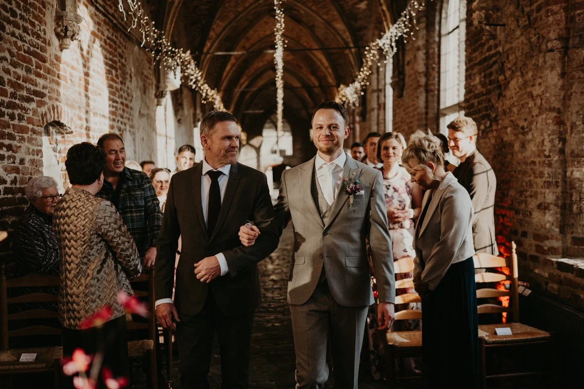 We vertrokken naar de trouwlocatie Kloster Graefenthal. In de prachtige gang gaat het bruidspaar elkaar voor het eerst zien. Alle ouders staan klaar om bij dit bijzondere first-lookmoment te zijn. Het was echt een sprookje om te zien hoe de bruid binnenkwam in de prachtige ruimte.