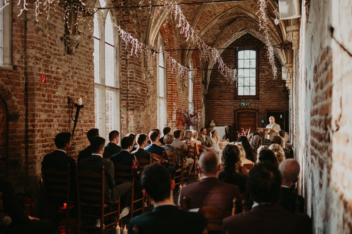 Intussen was de Kruisgang omgetoverd tot dinerzaal. Met een lange, mooi opgedekte tafel is dit echt een droomplek voor het diner. Er was een shared dining en halverwege ging het bruidspaar op een andere plek zitten om zo alle gasten te kunnen spreken.